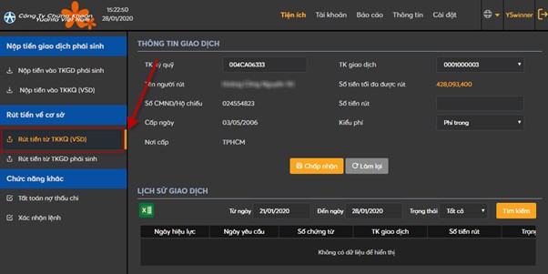 Trên thanh Menu nhấn chọn “Tiện ích” => “Rút tiền vào TKKQ (VSD)”: