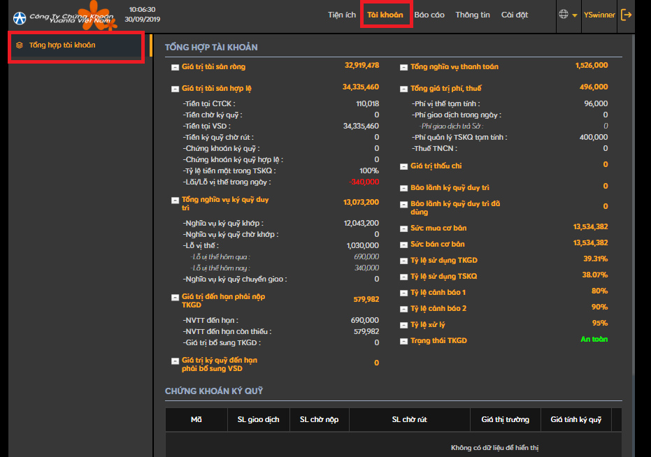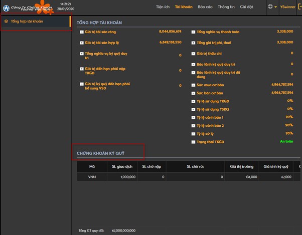Bước 1: Chọn tab “TÀI KHOẢN” → “Tổng hợp TK”. Màn hình thể hiện các thông tin tổng hợp của TKGD mà khách hàng đã chọn TKGD mặc định ở tab Cài đặt/Thiết lập tài khoản mặc định.