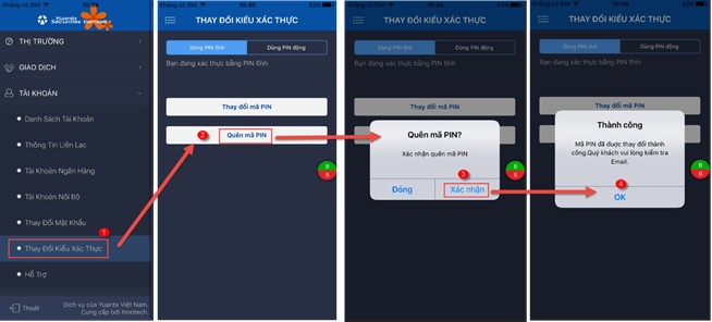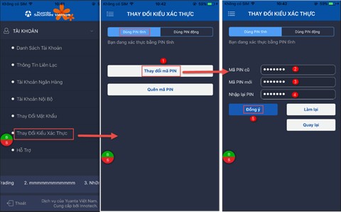 Bước 2: Nhập vào mã xác nhận hình ảnh (2) và xác thực mã PIN (3) → Bấm “Xác nhận” (4) → Hiển thị thông báo Thay đổi thành công.