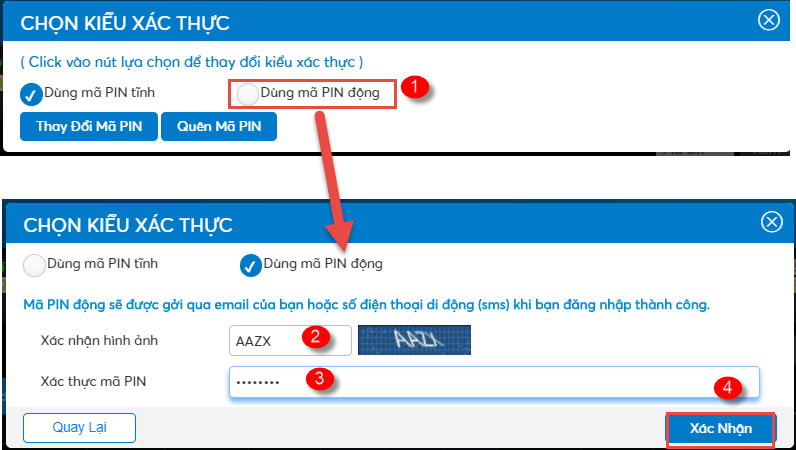 Vào menu “Tài khoản” → “Thay đổi kiểu xác thực” → Chọn tab “Dùng PIN động” (1) → Nhập xác thực PIN (3) → Bấm “Đồng ý” (4)