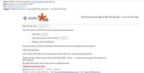 Bước 4: Một email từ hệ thống gửi về cho khách hàng như sau. Khách hàng đăng nhập vào hệ thống và có thể dùng mã PIN này để đổi lại PIN mới.