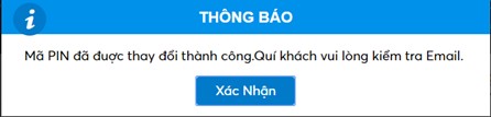 Bước 3: Thông báo mã Pin đã được thay đổi → Khách hàng kiểm tra email để thực hiện nhận mã PIN mới