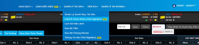 Truy cập Menu “Quản lý tài sản” → “Lãi lỗ tham khảo”. Màn hình hiển thị: