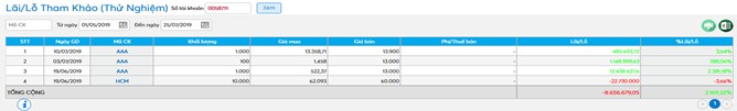 Màn hình truy vấn thông tin lãi lỗ tham khảo: