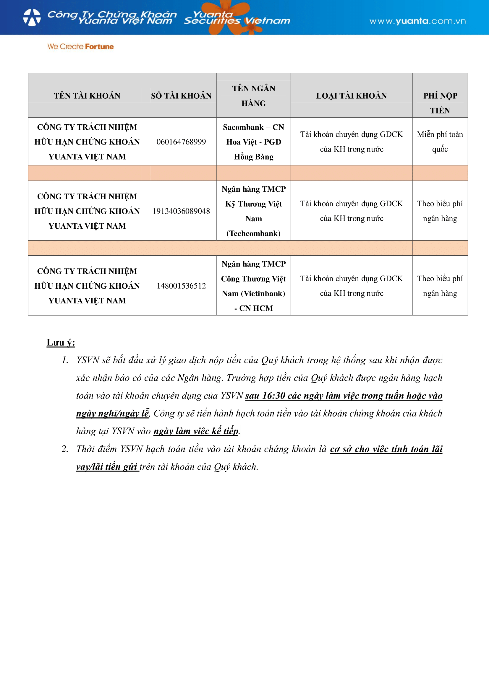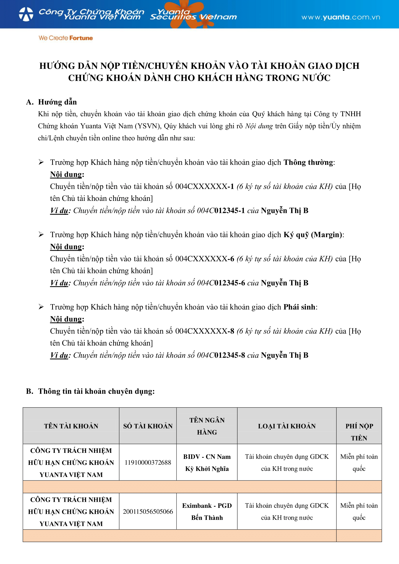 Để thực hiện nộp/rút tiền từ tài khoản giao dịch tại Yuanta Việt Nam, quý khách có thể thực hiện qua các cách sau: