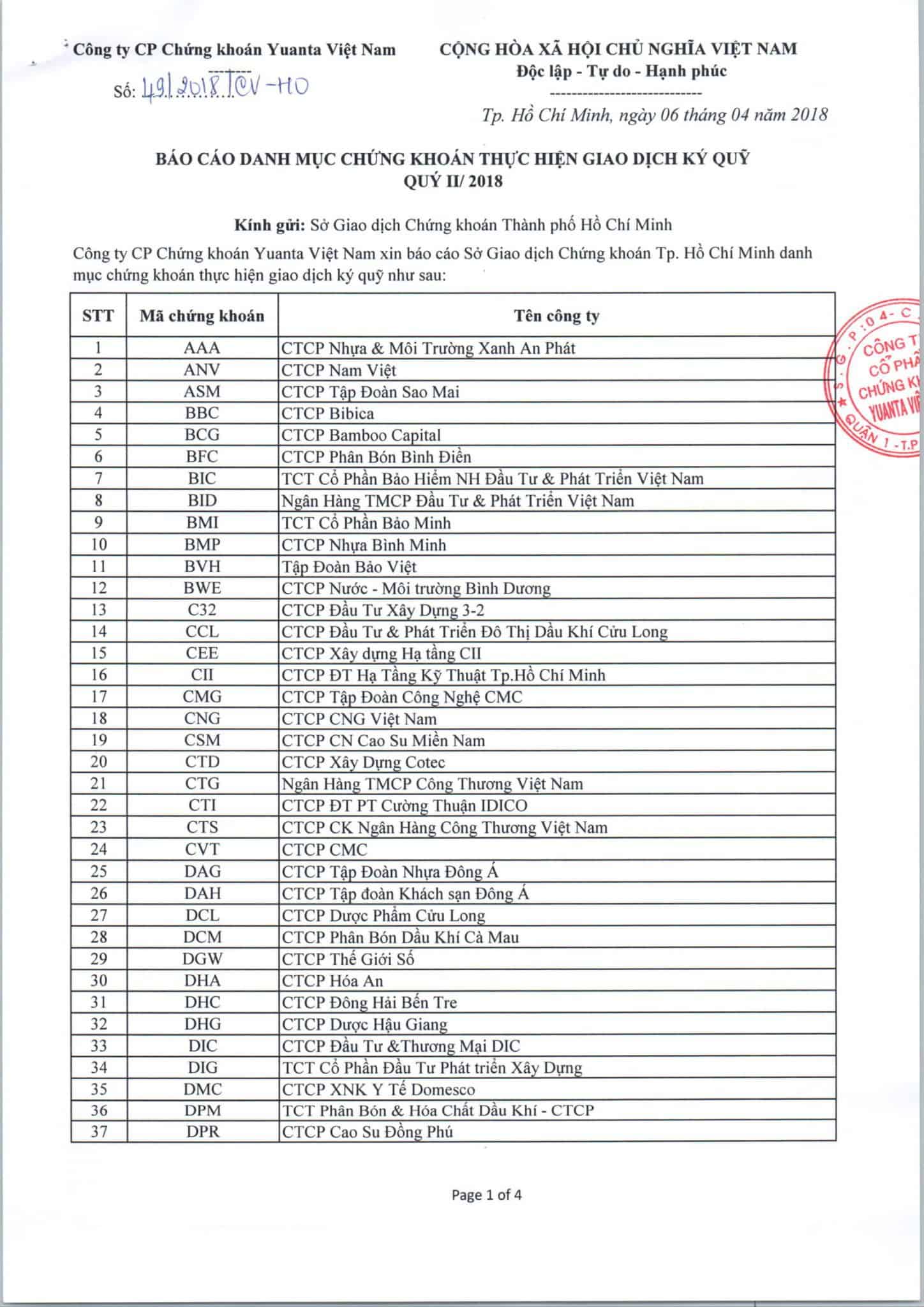 Báo Cáo Danh Mục Chứng Khoán Thực Hiện Giao Dịch Ký Quỹ 03/2018