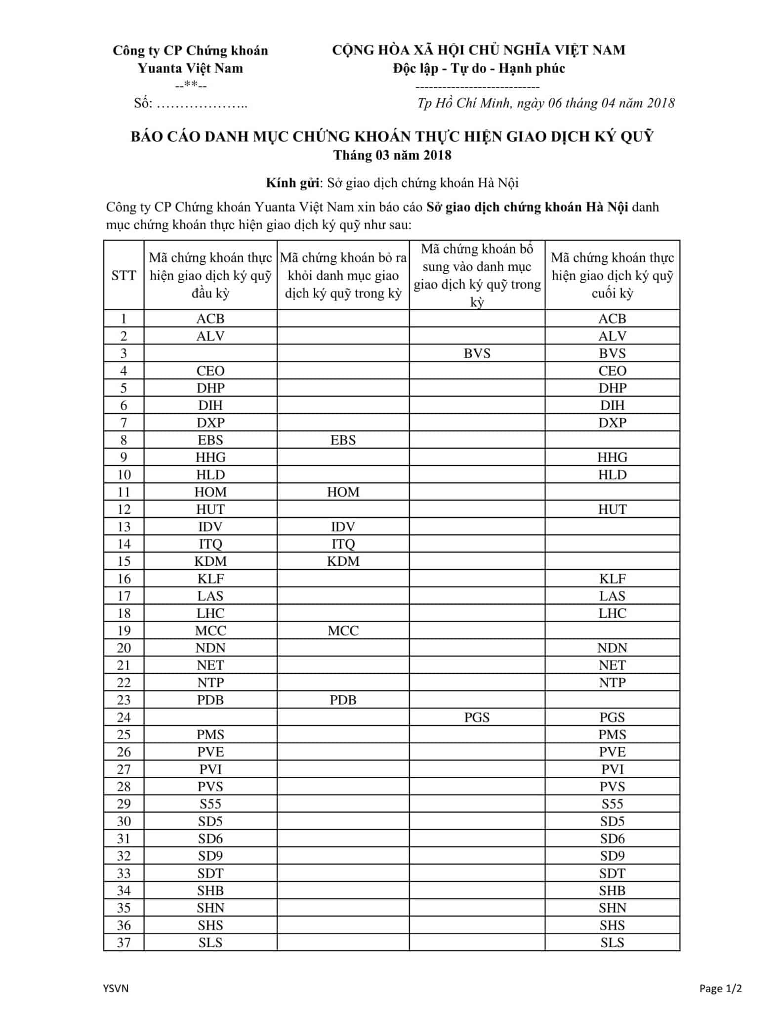 Báo cáo danh mục chứng khoán thực hiện giao dịch ký quỹ sàn HNX (03/2018)