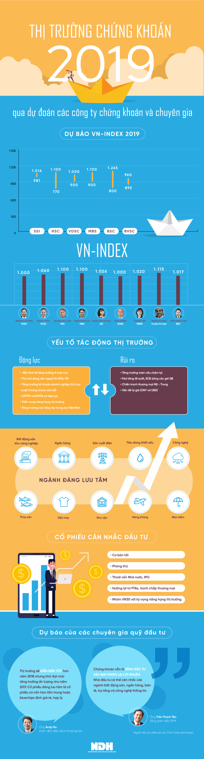 Song, thị trường vẫn được dự đoán sẽ tăng trưởng so với năm trước và VN-Index vào cuối năm 2019 có thể chinh phục lại mốc 1.000 điểm. Yếu tố bổ trợ cho điều này là sự tăng trưởng bền vững của nền kinh tế nội địa, hoạt động kinh doanh tiếp tục khởi sắc của doanh nghiệp và những yếu tố bổ trợ khác từ kỳ vọng nâng hạng thị trường, luật chứng khoán sửa đổi, định giá hấp dẫn…
