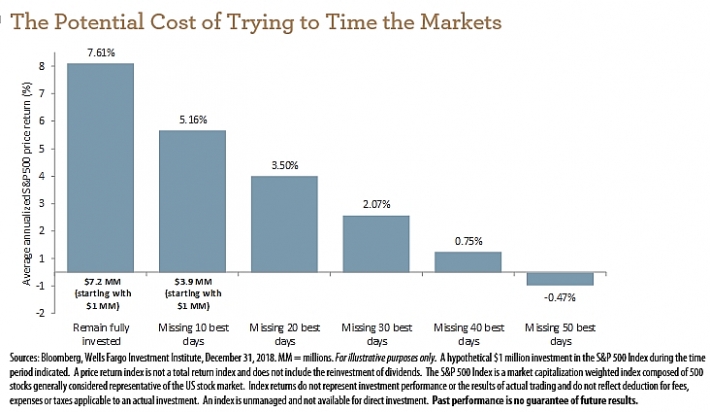 Về dài hạn, những người cố gắng đầu tư vào thời điểm thị trường chứng khoán bắt đáy và lên đỉnh sẽ có mức lợi nhuận thấp hơn so với những người đầu tư toàn thời gian, theo nghiên cứu của Viện Đầu tư Wells Fargo.