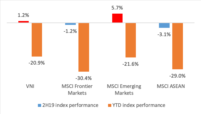 Khối ngoại bán ròng trong bối cảnh Việt Nam là thị trường vượt trội so với các thị trường cận biên khác. Theo thống kê của Yuanta Việt Nam (YSVN), tỷ suất sinh lợi của Vn-Index vẫn vượt trội so với các thị trường cận biên khác là 2 điểm phần trăm (%) trong nửa cuối 2019. Chỉ số Vn-Index cũng vượt trội hơn so với các thị trường cận biên kể từ đầu năm 2020, và so với cả khu vực ASEAN nói chung. Điều thú vị là, Vn-Index cũng (hơi) vượt trội so với chỉ số MSCI Emerging market Index (các thị trường mới nổi) từ đầu năm đến nay.