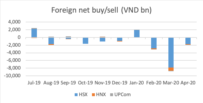 Bước sang 2020, dịch COVID-19 bùng phát càng khiến khối ngoại đẩy mạnh bán ròng ở tất cả các thị trường. Tuy nhiên, cần lưu ý rằng, Việt Nam là thị trường ít bị bán ròng nhất trong khu vực và do đó tác động vào thị trường chứng khoán Việt Nam là thấp hơn rất nhiều so với hầu hết các thị trường tương tự trong khu vực. Theo Bloomberg, giá trị bán ròng của khối ngoại từ đầu năm đến nay đã đạt 685 triệu USD tại Philippines, 741 triệu USD ở Indonesia, 1.870 triệu USD ở Malaysia và 3.749 triệu USD ở Thái Lan. Tất cả đều cao hơn con số bán ròng 381 triệu USD tại Việt Nam (HSX). (Lưu ý: những số liệu này chỉ xem xét mỗi chỉ số chính của quốc gia).  Các nhà đầu tư có lẽ đã bắt đầu cân nhắc về việc tại một thời điểm nào đó việc định giá cổ phiếu (hiện đa phần là hấp dẫn) và khả năng phục hồi kinh tế sớm có thể xảy ra (giả sử COVID được kiểm soát vào cuối quý 2 2020) sẽ khiến xu hướng mua ròng quay trở lại.