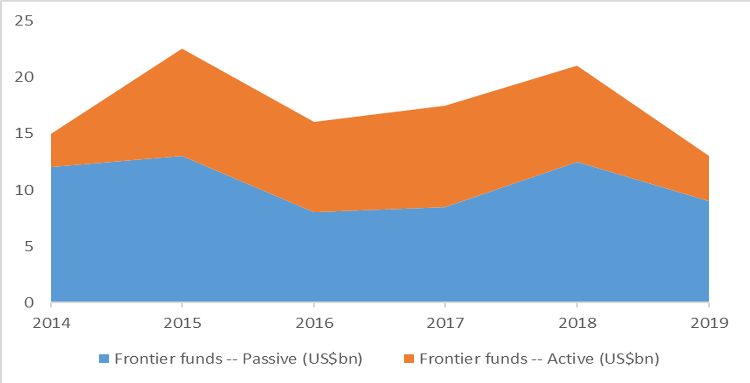 Hình 3: Chúng tôi ước tính AUMs các quỹ đầu tư thị trường cận biên trên thế giới đã giảm khoảng 35% – 40% trong năm 2019