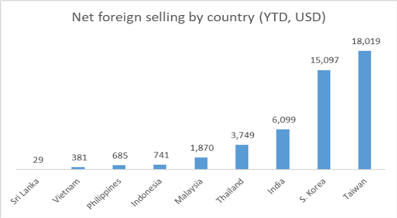 Hình 5: Khối ngoại bán ròng tại các thị trường mới nổi lớn hơn nhiều so với Việt Nam