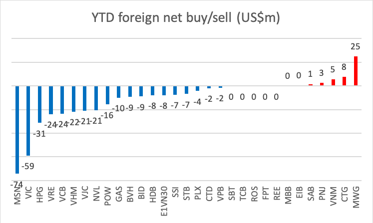 Chúng tôi tin rằng đà bán này cuối cùng sẽ tự kết thúc với câu chuyện vĩ mô hấp dẫn tại Việt Nam. Điều này ngụ ý sự cần thiết phải đánh giá khu vực mà khối ngoại đã tập trung bán ròng. Khối ngoại bán ròng tập trung tại các cổ phiếu thuộc chỉ số MSCI Frontier/Emerging Index. Điều đó có nghĩa là những cổ phiếu kín room ngoại ít bị bán hơn.