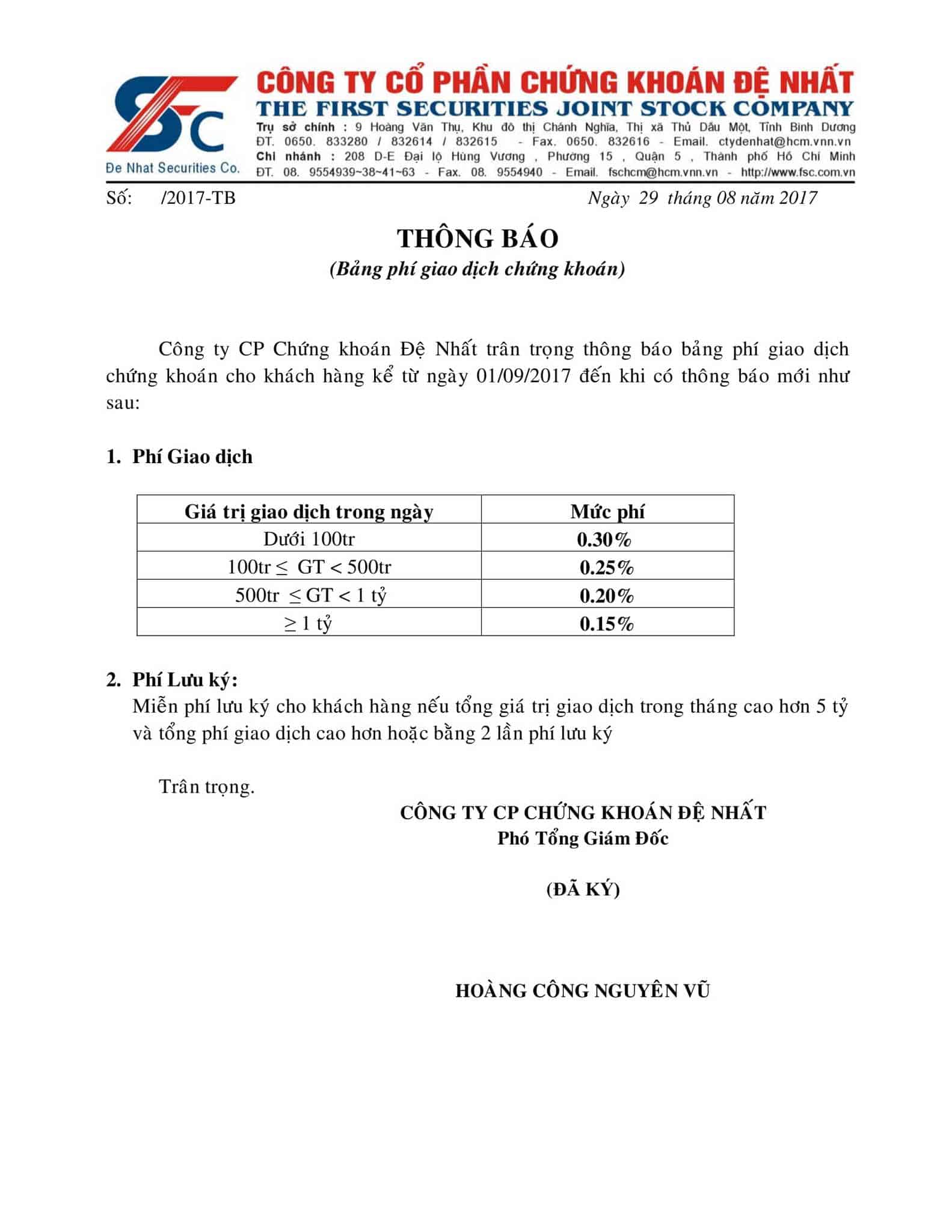 FSC – Thông báo phí giao dịch chứng khoán từ ngày 01/09/2017