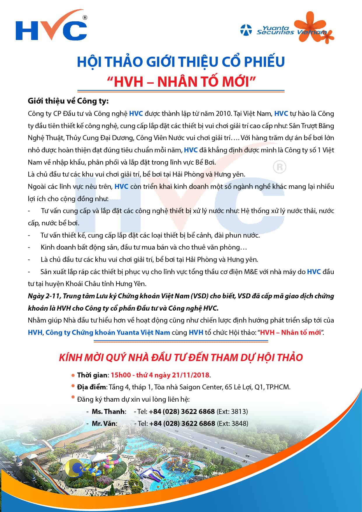 Công ty Chứng khoán Yuanta Việt Nam (YSVN) trân trọng kính mời Quý Nhà đầu tư đến tham dự buổi hội thảo giới thiệu cổ phiếu “HVH – Nhân tố mới” do YSVN phối hợp với Công ty cổ phần Đầu tư và Công nghệ HVC tổ chức.
