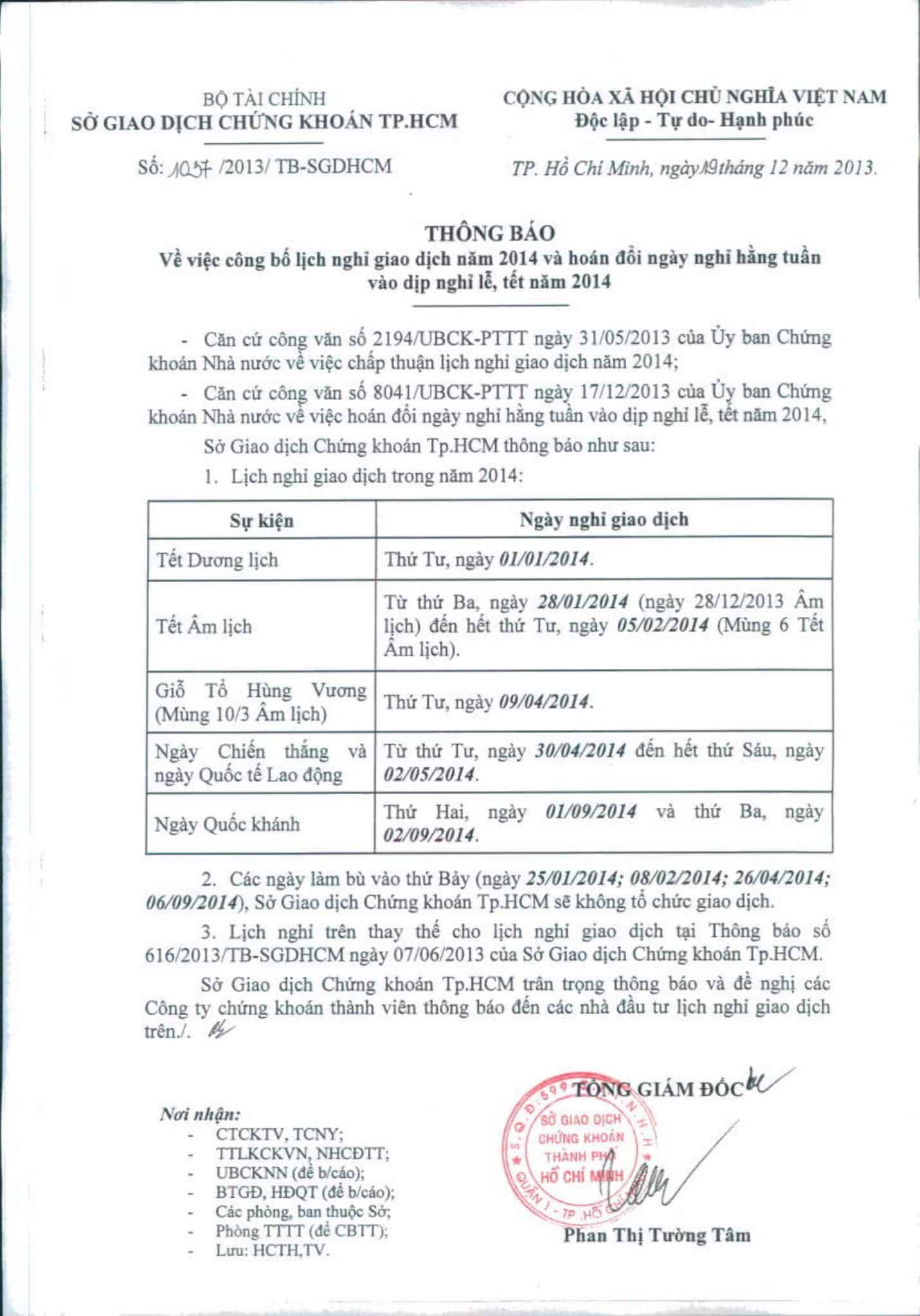 HOSE: Thông báo lịch nghỉ giao dịch năm 2014