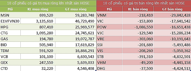 Về top mua ròng, nhà đầu tư nước ngoài tập trung gom MSN (59 tỉ đồng), E1VFVN30 (46,7 tỉ đồng), HPG (26 tỉ đồng), CTG (24,7 tỉ đồng), GAS (19 tỉ đồng).
