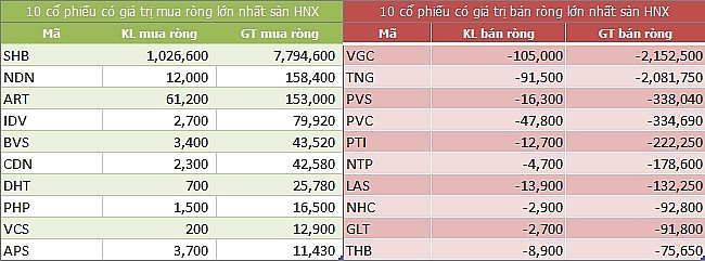 Trên sàn HNX, khối ngoại mua ròng 2,5 tỉ đồng với khối lượng 792.810 đơn vị. Trong đó, các mã được mua ròng nhiều nhất là SHB (7,7 tỉ đồng), NDN (156 triệu đồng), ART (153 triệu đồng).Diễn biến thị trường trên sàn HNX