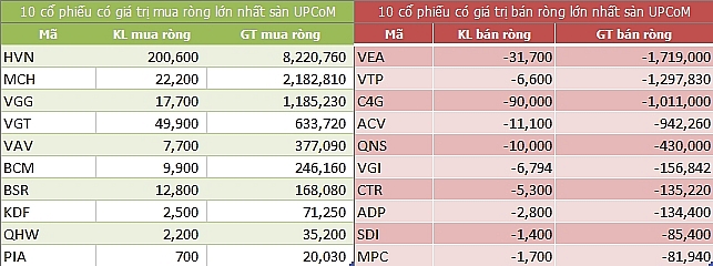 Tại thị trường UPCoM, khối ngoại mua ròng 7,2 tỉ đồng với khối lượng 159.806 đơn vị. Đáng chú ý, nhà đầu tư nước ngoài tập trung mua ròng HVN (8,2 tỉ đồng) và bán ròng VEA (1,6 tỉ đồng).