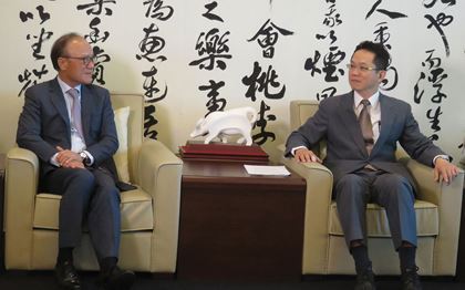 Tổng giám đốc Sở GDCK Đài Loan, ông Lih-Chung Chien (bên phải) cùng Tổng giám đốc Tập đoàn Chứng khoán Yuanta, ông Arthur Chen trong cuộc trả lời phỏng vấn các nhà báo đến từ Việt Nam.