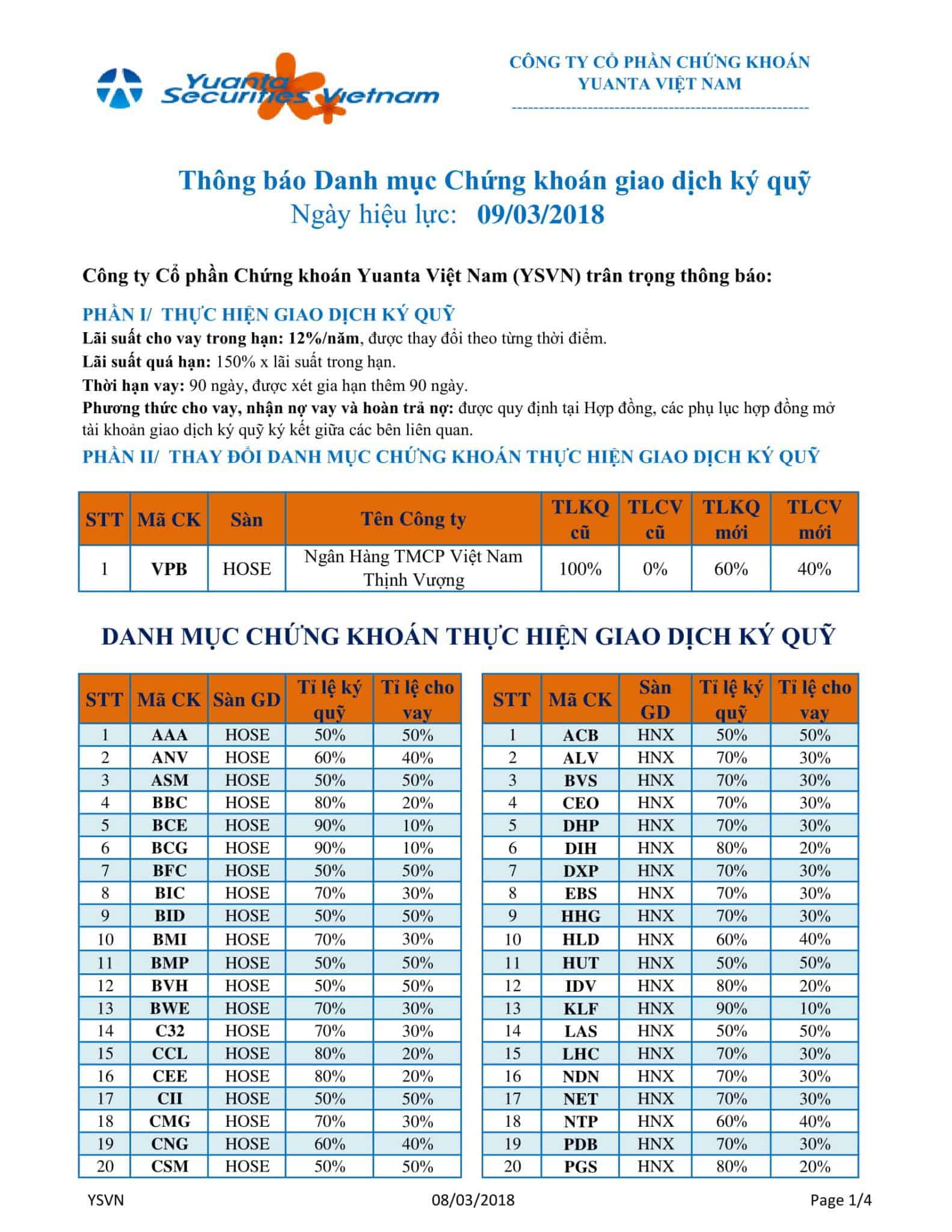 Thông báo Danh mục Chứng khoán giao dịch ký quỹ ngày 09/03/2018