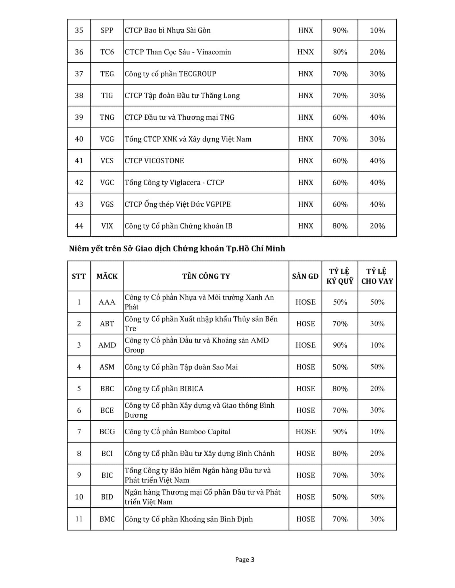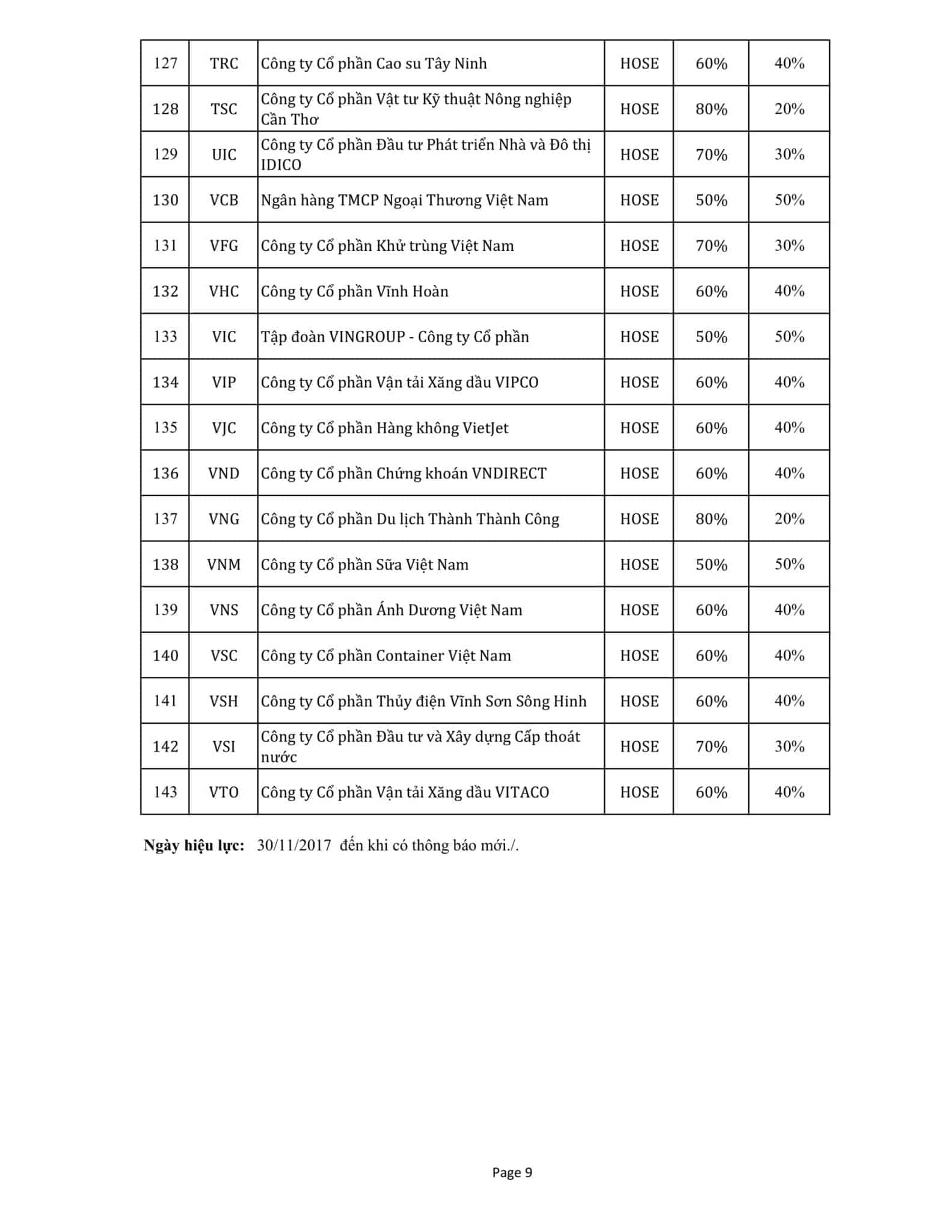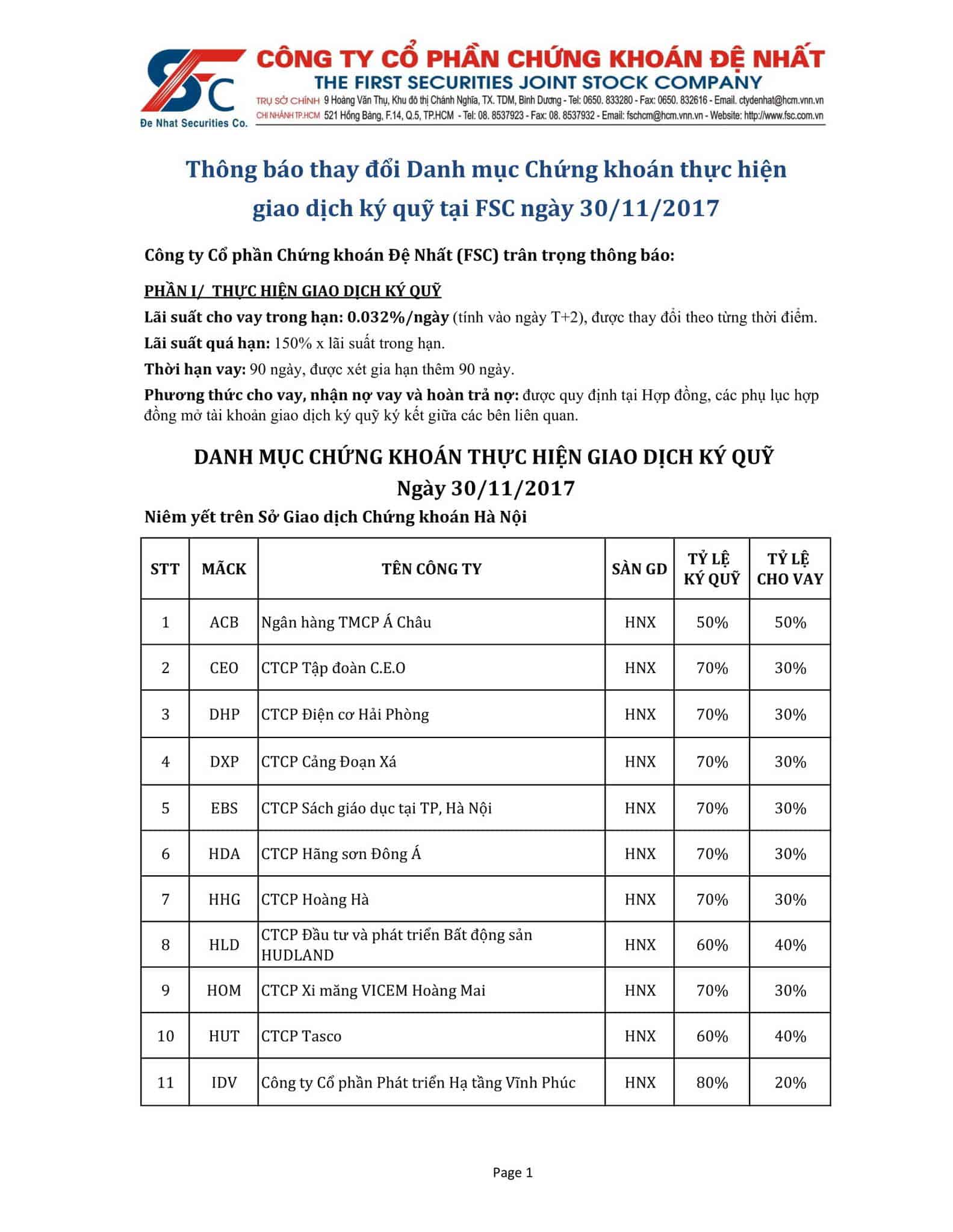 Thông báo thay đổi Danh mục Chứng khoán thực hiện giao dịch ký quỹ tại FSC ngày 30/11/2017