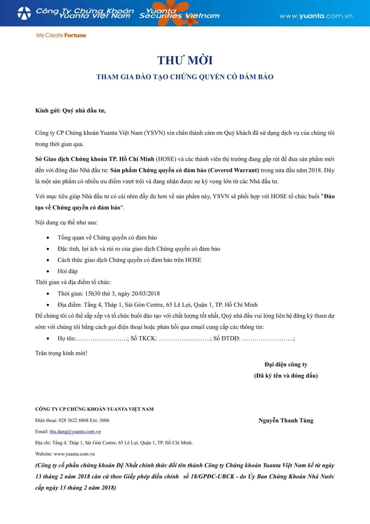 Thư Mời Tham Gia Đào Tạo Chứng Quyền Có Đảm Bảo