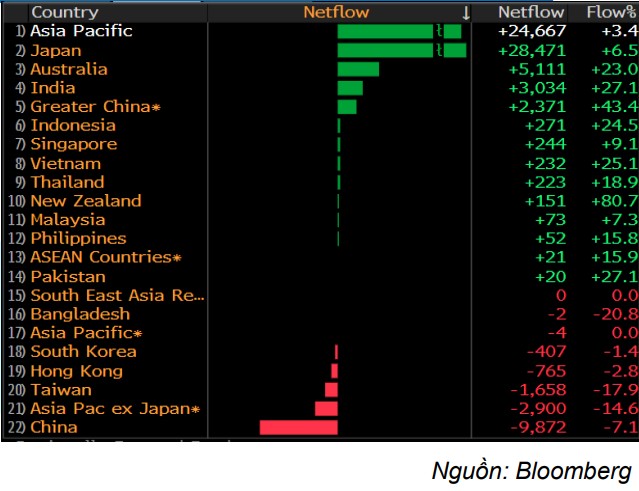 Các quốc gia trong khu vực châu Á được khối ngoại đổ tiền và và rút tiền ra các quỹ ETF